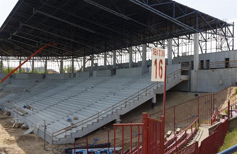 Trwają prace na dachu trybuny południowej. Instalowane są przezroczyste poliwęglany. Docelowo powstaną trzy rzędy przezroczystego poszycia. Do końca miesiąca na pewno nie zostaną zamontowane siedziska, choć trybuny i umocowania są już na to przygotowane. Nie uda się dotrzymać terminu oddania do użytku dwóch trybun z pełnym zapleczem gastronomicznym i sanitarnym do końca drugiego kwartału.