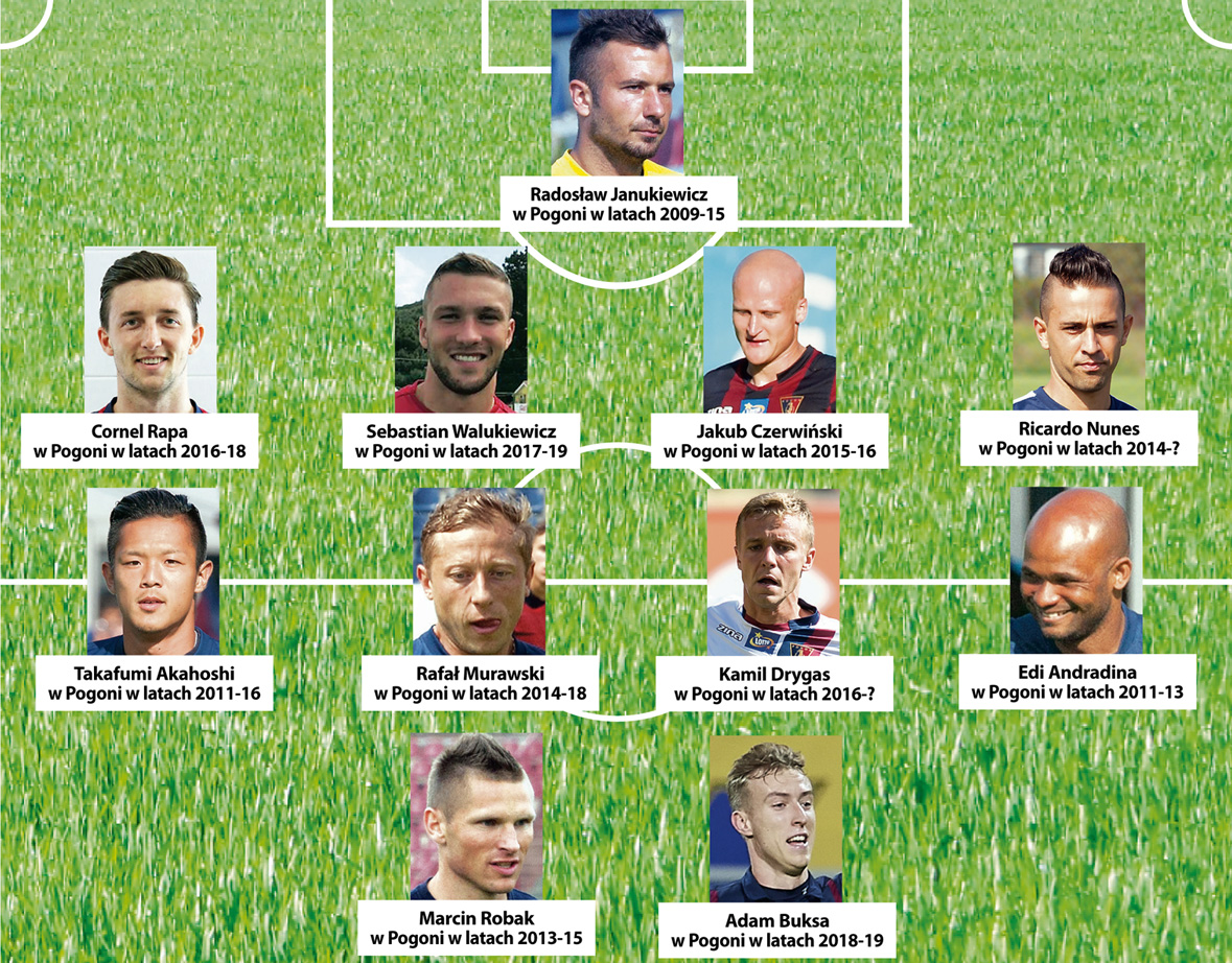 W naszej jedenastce nie ma ani jednego wychowanka, jest tylko czterech obcokrajowców, co dowodzi tezie, że najlepiej jest stawiać na piłkarzy krajowych. Dwóch piłkarzy: Nunes i Drygas wciąż grają dla Pogoni, choć w rundzie jesiennej z uwagi na kontuzje obaj niewiele mogli pomóc. ©℗