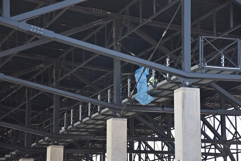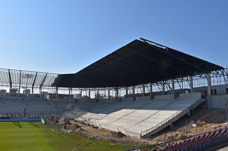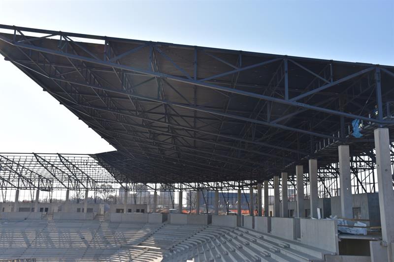 W pawilonach znajdujących się na koronie obiektu, trwa montaż pokrycia dachów oraz realizowane są roboty wewnętrzno-instalacyjne. Na samym obiekcie stadionu trwa jeszcze montaż pokrycia dachu nad trybuną zachodnią.