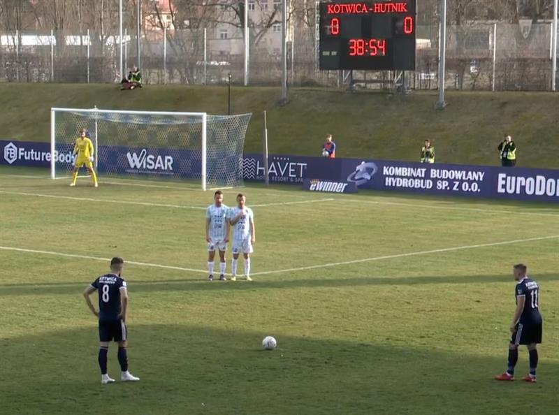 Mimo wspomnianych roszad, gra gospodarzy była dość bezbarwna, a duża optyczna przewaga nie przekładała się na podbramkowe sytuacje. W pierwszej połowie goście zadrżeli w 29. minucie, gdy w polu karnym piłka otarła rękę ich stopera Dawida Kubowicza, grającego przed laty w I-ligowej wówczas Flocie Świnoujście.
