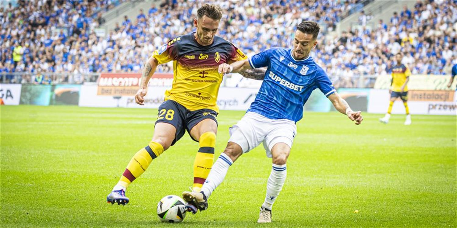 Pierwsza połowa rozpoczęła się od huraganowych ataków Kolejorza, które także w dalszej części spotkania były kontynuowane i wielokrotnie kończyły się groźnymi dośrodkowaniami, wprowadzającymi sporo zamieszania pod szczecińską bramką. Już w 1. minucie Ishak w sytuacji sam na sam przegrał pojedynek z Cojocaru. Następnie po centrze Zech wybił na korner piłkę, na którą już czekało dwóch poznaniaków na obiecujących pozycjach. Po chwili szczeciński golkiper odbił strzał Sousy, a dobitce zapobiegł Wahlqvist, z najwyższym trudem wybijając piłkę za boisko. Doszło też do kontrowersyjnej sytuacji. gdy Ishak uderzył Koútrisa, za co dostał tylko żółtą kartkę, podobnie jak Grosicki, który stanął w obronie szwedzkiego kolegi. Pierwszą akcję portowcy przeprowadzili w 9. minucie, ale Łukasiak strzelił zbyt lekko. W 18. minucie Hotić uderzył obok bramki, a po chwili po zespołowej akcji poznaniaków i strzale Pereiry, piłka zrykoszetowała od Borgesa i wyszła na rzut rożny. Gospodarze reklamowali zagranie ręką szczecińskiego stopera, ale po konsultacji z VAR-em arbiter nie podzielił tych roszczeń. W 25. minucie tuż obok słupka strzelił Kozubal. Pięć minut później Ishak w sytuacji sam na sam uderzył z pierwszej piłki z półwoleja nad poprzeczką. W odpowiedzi Grosicki strzelił z bliska, ale z ostrego kąta, a Mrozek obronił nogą. W tym kilkuminutowym okresie dobrej gry portowców, w obiecującej sytuacji Kouloúris został zablokowany, a po chwili w polu karnym bez piłki staranowano Łukasiaka, ale sędzia nawet nie pytał VAR-u o jedenastkę... Szybko do głosu powrócili gospodarze i w 36. minucie strzał Kozubala obronił Cojocaru. W ostatniej minucie przed przerwą Zech sfaulował zbliżającego się do bocznej linii pola karnego Sousę, za co Austriak otrzymał żółtą kartkę, ale po konsultacji VAR-u zmieniono ją na czerwień, a rzut wolny Pereiry został obroniony.