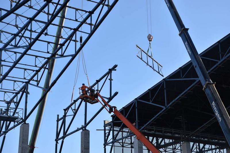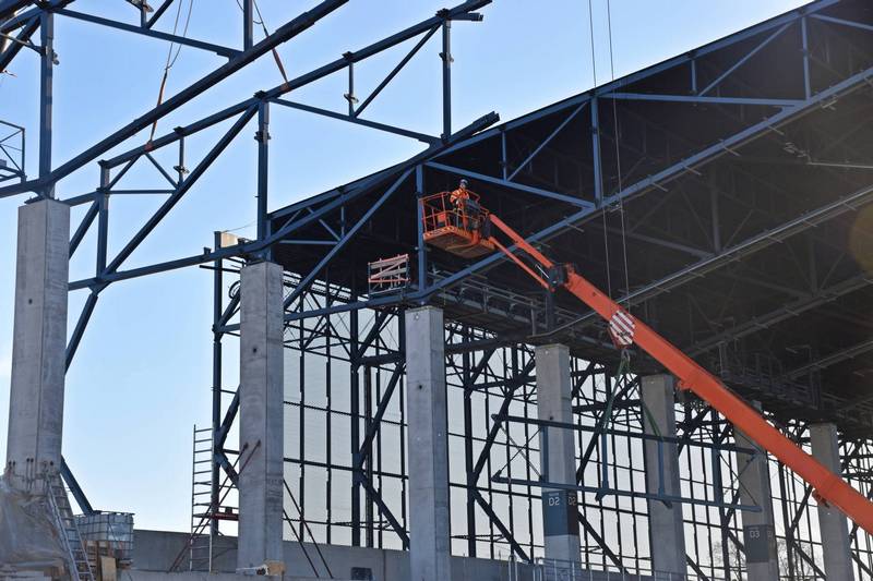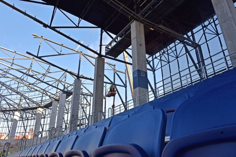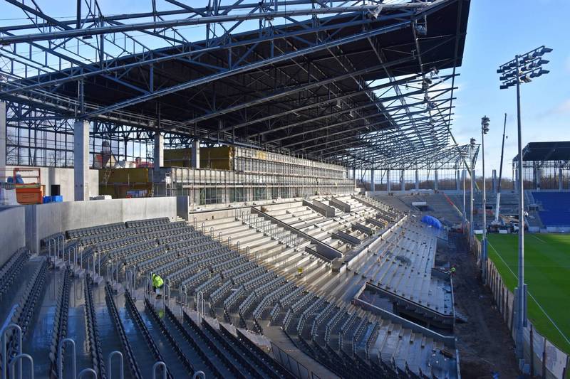 Przez ostatnie tygodnie prace były prowadzone głównie przy zabudowie łącznika trybuny północnej i wschodniej. Montowano stalowe elementy konstrukcyjne zadaszenia na ostatnim z filarów obiektu. Do wykonania pozostanie jeszcze pokrycie dachu. Prace toczą się również na trybunie północnej. Wykonywane są posadzki, trwa montaż instalacji, układane są płytki, wykonywana jest termoizolacja, prowadzone są prace malarskie. Wykonywane jest również szklenie fasad.
