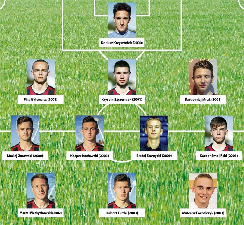 Spośród szesnastki piłkarzy z rocznika 2000 lub młodszych mamy aż sześciu, którzy zadebiutowali już w ekstraklasie. Z rocznika 2000 są to Maciej Żurawski i Adrian Benedyczak, z rocznika 2001 Kacper Smoliński, z rocznika 2002 Marcel Wędrychowski i z rocznika 2003 Kacper Kozłowski i Hubert Turski. Smoliński ma już na tym poziomie rozgrywek na koncie gola i asystę, a Żurawski asystę.