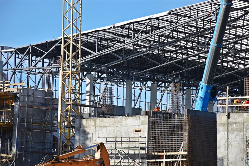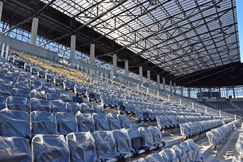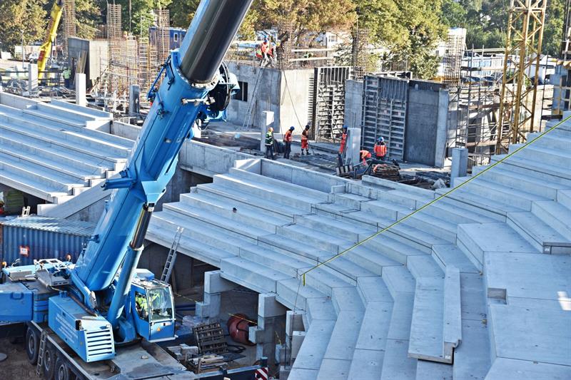 Przy łączniku trybuny wschodniej i południowej, trwa montaż prefabrykatów, na których spoczną płyty audytoryjne. Kontynuowane są prace żelbetowe. Na łuku zamontowanych zostało już pięć słupów prefabrykowanych, które będą częścią konstrukcji zadaszenia trybuny.