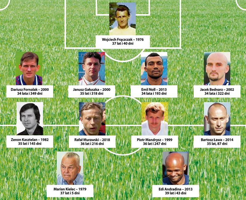 W ataku zostawiliśmy miejsce dla piłkarzy zasługujących na miano geniuszów futbolu na skalę oczywiście Pogoni. W wieku 37 lat i 5 dni swój ostatni mecz w ekstraklasie rozegrał Marian Kielec, ale był to występ iluzoryczny po prawie 10-letniej przerwie.