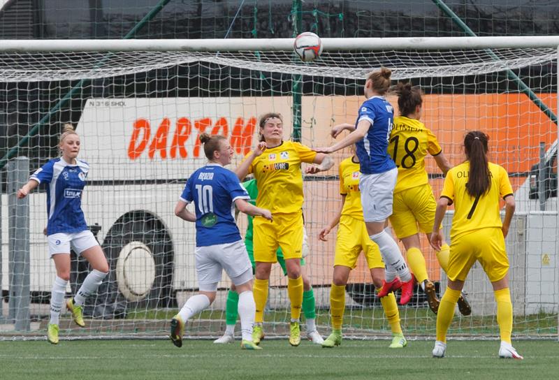 W pierwszej połowie więcej z gry miał zespół gości, ale to Olimpia jako pierwsza groźnie zaatakowała. W 10 minucie Grosicka uderzyła piłką w słupek. W 20 minucie Litwiniec wypuściła z lewej strony Szymaszek, która wbiegła w pole karne i prawą nogą pokonała bramkarkę gości. Najlepsza sytuacja na gola w drużynie przeciwnej, była wynikiem błędu Olimpii przy rozgrywaniu piłki od bramki. Okazji nie wykorzystała Jedlińska. Było jeszcze kilka strzałów z dystansu w drużynie rywalek, ale bez większego zagrożenia.