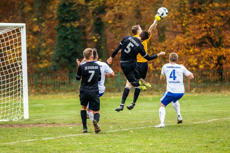 Najefektowniejsza była wygrana szczecińskiego Jezioraka, bo wysoka 3:0 i odniesiona na wyjeździe, a rywal Pomorzanin Nowogard zajmuje wysokie, 4. miejsce w tabeli. Początek meczu należał do gospodarzy, lecz jedynym efektem zmasowanego szturmu była poprzeczka, a później strzelać zaczęli goście ze stolicy województwa: w 35 minucie Patryk Gawiński, siedem minut później Paweł Olejnik i w 65 minucie Dawid Kapczyński.