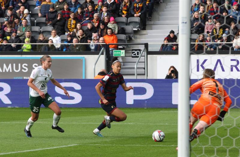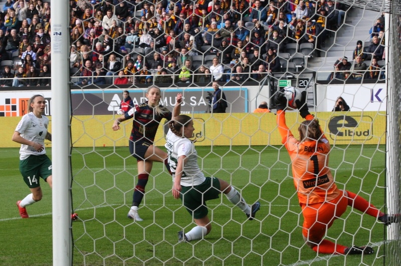 Pierwszy w historii mecz kobiecej Pogoni na Stadionie Miejskim im. Floriana Krygiera w pierwszej połowie był dość wyrównany, z lekkim wskazaniem na podopieczne szczecińskiego trenera Piotra Łęczyńskiego. Po nieco ponad dwudziestu minutach gry, Oleszkiewicz znalazła się w sytuacji sam na sam z Bocian, jednak górą była bramkarka Śląska. Kolejne świetne okazje do zdobycia bramki miały Litwiniec oraz Okoniewska, lecz ich strzały były nieznacznie niecelne.