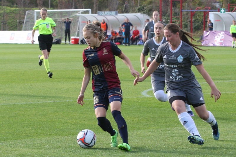 W pierwszym kwadransie lepiej prezentował się zespół gości i na początku meczu z dystansu uderzała Martyna Bartczak. W 10. i 11. minucie dwie okazje miała Aleksandra Stasiak, która oddała strzały wślizgiem, a w pierwszej sytuacji piłka otarła się o słupek. Następnie do głosu doszły piłkarki Pogoni. W 16. minucie z piłką w pole karne wbiegła Aleksandra Kuśmierczyk i została sfaulowana, a rzut karny uderzając na raty, wykorzystała Weronika Szymaszek. W 20. minucie powinno być 2:0 dla gospodyń. W sytuacji sam na sam z bramkarką gości znalazła się Malwina Szcześniak i po jej minięciu... nie trafiła do pustej bramki. W 29. minucie gol dla Pogoni nie został uznany, gdyż Roksana Ratajczyk była na pozycji spalonej, zaś minutę później nastąpiło podwyższenie wyniku. Z piłką w pole karne wbiegła Natalia Oleszkiewicz, minęła Natalię Piątek i wbiła piłkę do pustej bramki. Jeszcze przed przerwą groźny strzał głową w zespole gości oddała Stasiak, ale dobrze zachowała się Natalia Radkiewicz. W 45. minucie drugą bramkę w tym spotkaniu zdobyła Oleszkiewicz, która odebrała piłkę obrończyni Sportisu i uderzając w środek bramki, podwyższyła rezultat.