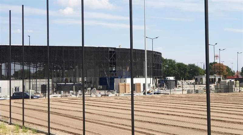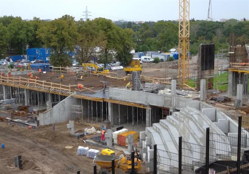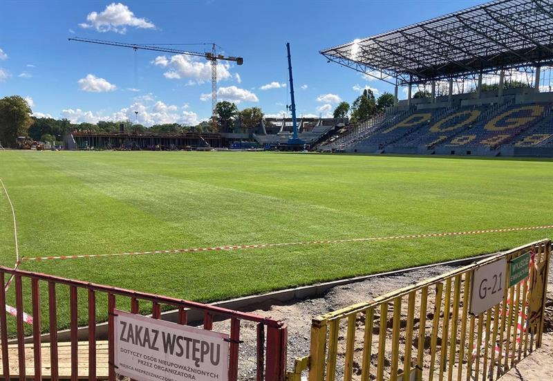 Na obiekcie przy ul. Twarowskiego rośnie trybuna wschodnia, toczy się też szereg prac na bocznych boiskach i przy zagospodarowaniu terenu. Po wykonaniu niezbędnych prac instalacyjnych układanie trawiastej nawierzchni trwało kilka dni. Nowa murawa to tzw. hybryda, czyli połączenie włókien syntetycznych i naturalnych.