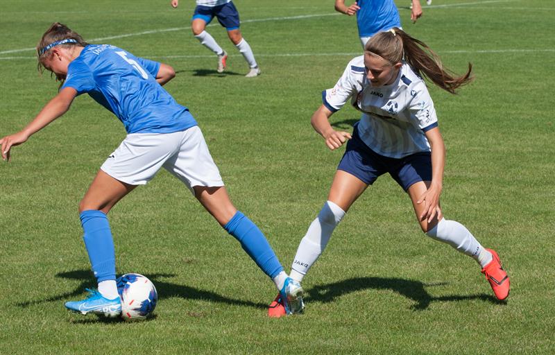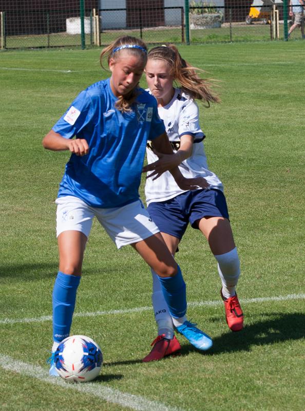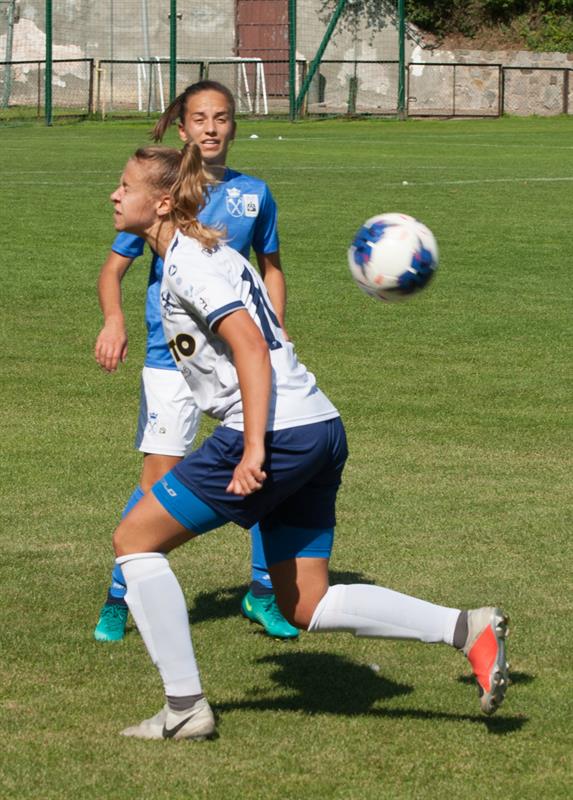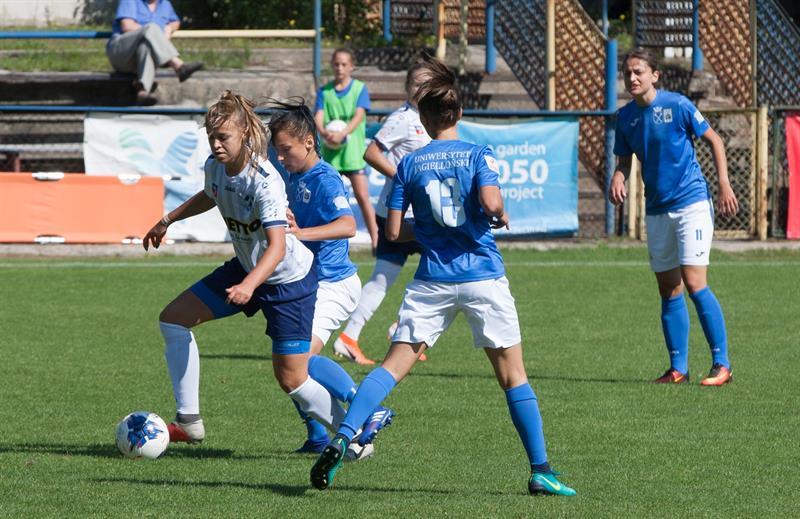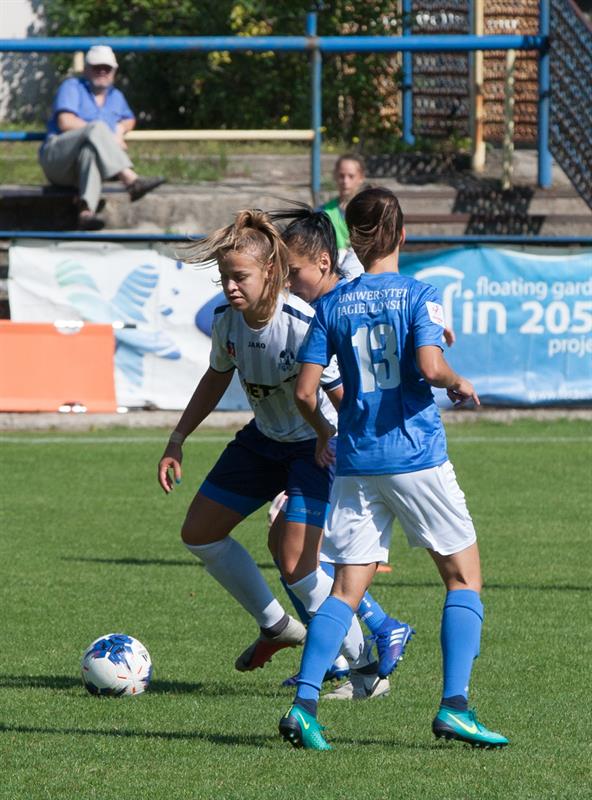 Pierwsza połowa, toczona w promieniach wakacyjnego słońca, była spokojna i rozgrywana w dość wolnym tempie. Gra była wyrównana, chociaż niewielką optyczną przewagę posiadały krakowianki. Najistotniejsze wydarzenie w tej części gry miało miejsce w 22 minucie, kiedy to szczecińska bramkarka Pastusiak sfaulowała w polu karnym jedną z rywalek, a celnym strzałem z jedenastki popisała się Nieciąg, wyprowadzając swą drużynę na prowadzenie.