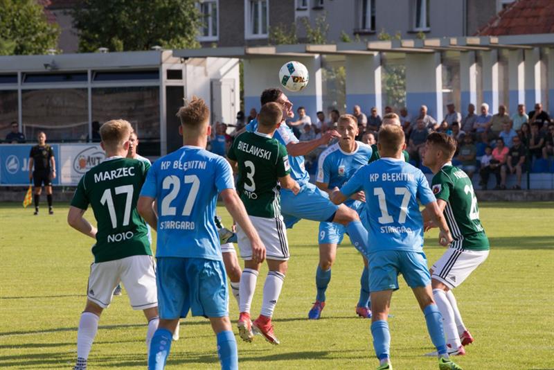 Po przerwie zaatakowali katowiczanie, a nieznacznie ostudził ich Kwiatkowski, główkując tuż koło słupka. Później Błękitni grając wysokim pressingiem, jak gdyby opanowali sytuację, jednak bliski wyrównania był rutyniarz Wróbel, ale nieco nieczysto trafił w piłkę. W 80 minucie interwencja bramkarza Rzepeckiego poza polem karnym skończyła się żółtą kartką i rzutem wolnym, z którego Gancarczyk trafił w słupek, a dobitka Wróbla była niecelna. Gdy już wydawało się, że nasz zespół utrzyma prowadzenie, w trzeciej, przedostatniej minucie doliczonego czasu gry, po dośrodkowaniu Mońki, bramkę na wagę remisu zdobył Gałecki, a po chwili sędzia zakończył zawody, z których wyniku bardziej zadowoleni byli goście, a stargardzianie nie kryli rozczarowania... ©℗ (mij)