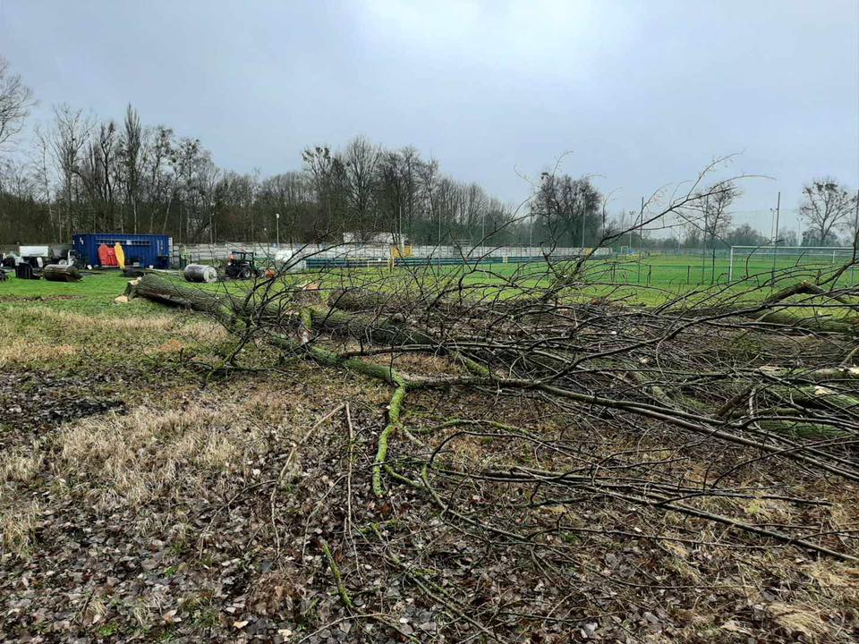 Na początek rozpoczęła się wycinka drzew (głównie topoli), które były zlokalizowane za bramką od strony południowej boiska nr 1 (od strony szatni). W tym miejscu powstanie całoroczne boisko kryte z zadaszeniem pneumatycznym wraz z zapleczem socjalnym oraz parkingi i droga dojazdowa, w tym do sektora dla kibiców gości.