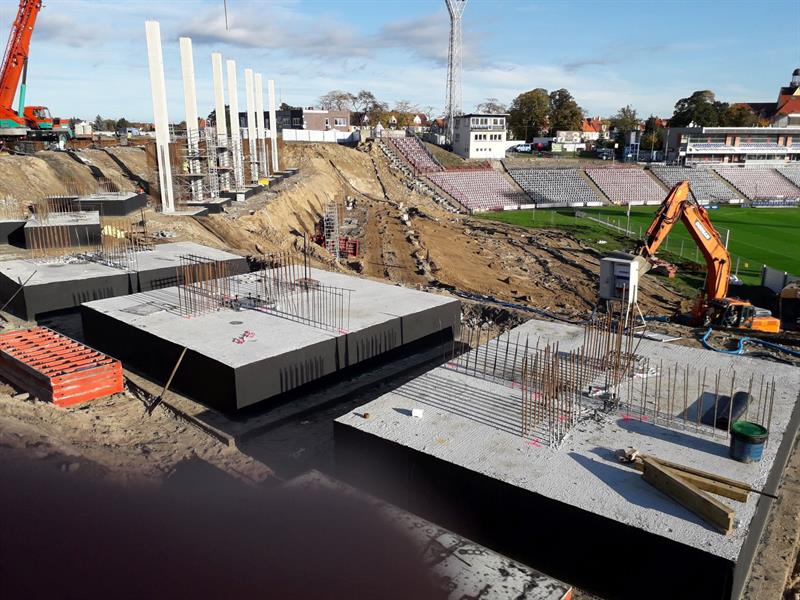 Przy powstających trybunach stadionu, prace ziemne i fundamentowe toczą się nieustanie od kilkunastu tygodni. Trwa również montaż słupów prefabrykowanych oraz belek audytoryjnych i audytoriów. W minionych dniach rozpoczął się montaż ścian monolitycznych na koronie trybuny południowej i zachodniej.