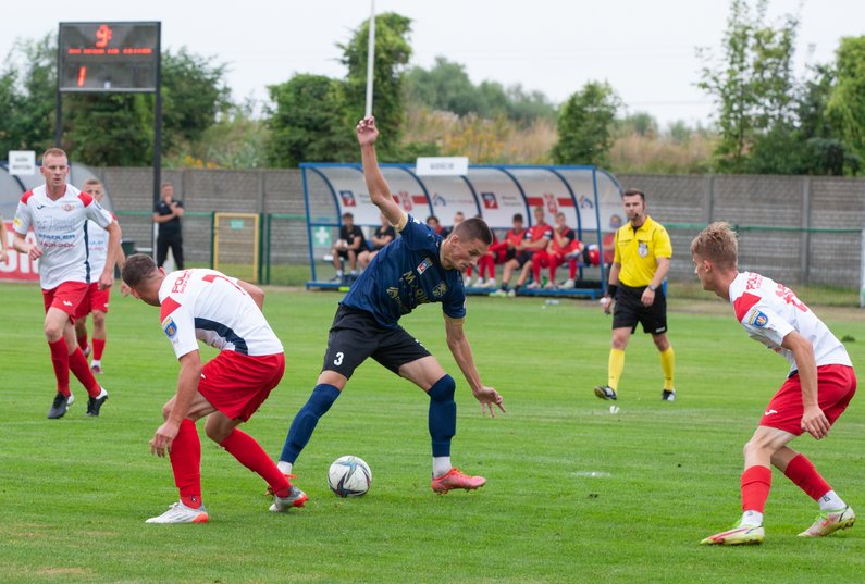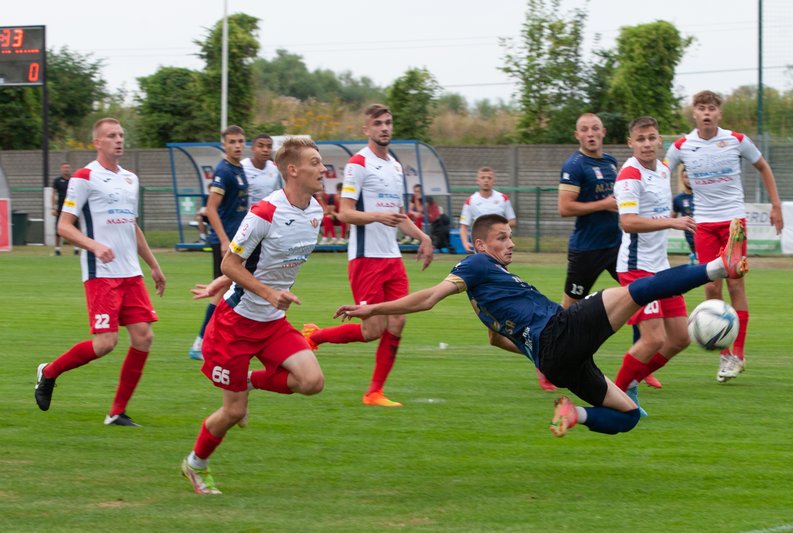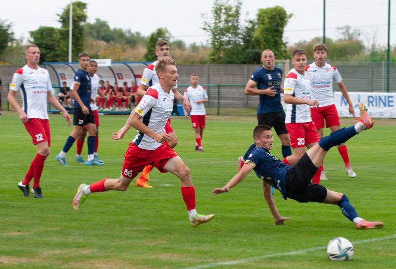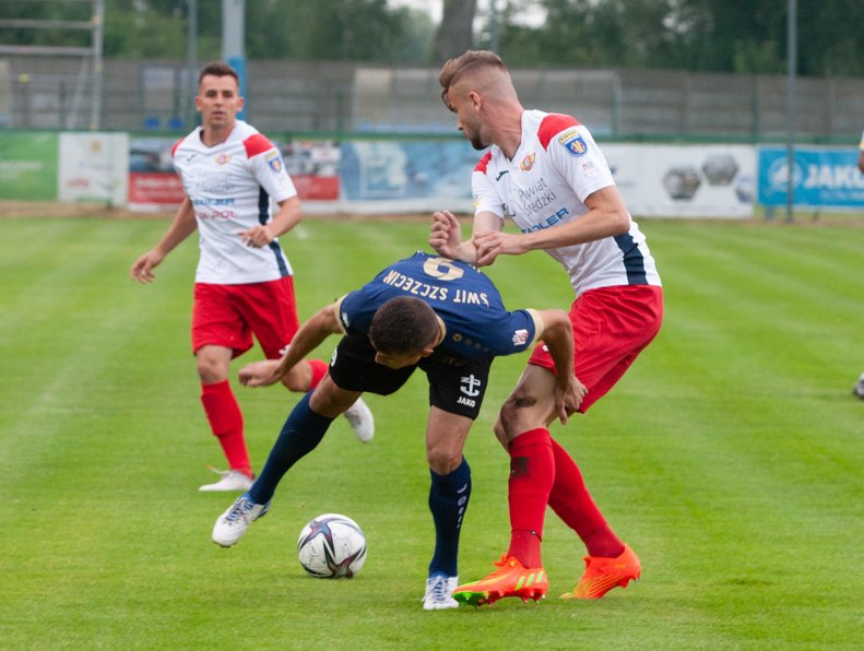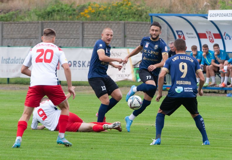 Świt Skolwin (mimo gry na własnym stadionie, po raz pierwszy w wyjazdowych granatowo-czarnych strojach) przeprowadził wiele składnych akcji ofensywnych. Fot. Ryszard PAKIESER