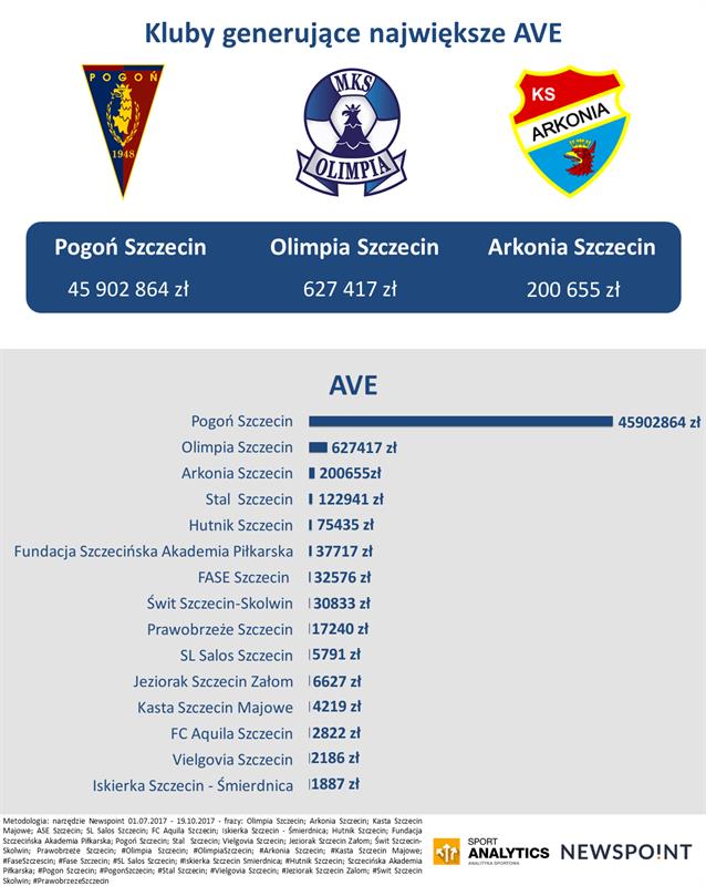 Jeśli chodzi o zasięg publikacji, bezdyskusyjnie prowadzi Pogoń (blisko 219 mln) przed Olimpią (2,8 mln), Arkonią (0,9 mln), Stalą (0,6 mln) i Hutnikiem (0,3 mln). Natomiast w kwestii współczynnika AVE także ewidentnie przoduje Pogoń (46 mln zł) wyprzedzając Olimpię (0,6 mln zł), Arkonią (0,2 mln zł), Stal (0,1 mln zł) i Hutnika (0,07 mln zł).