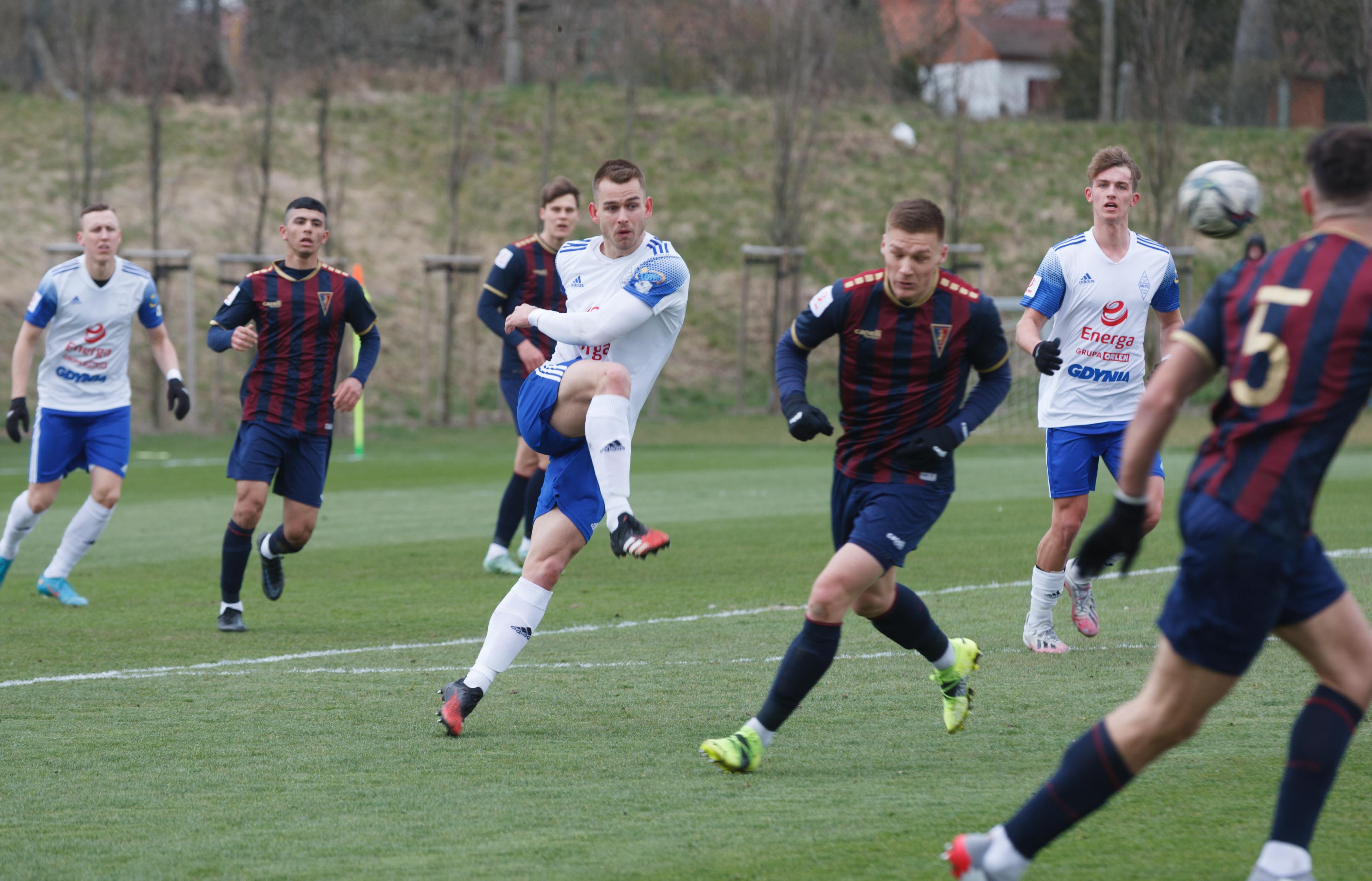 Goście z Gdyni zostali zepchnięci do defensywy i rozpaczliwie próbowali powstrzymać ofensywne zapędy portowców. Sił i umiejętności wystarczyło im na pół godziny, a po upływie tego czasu w polu karnym Kacper Kostorz, dograł do nadbiegającego Oskara Kalenika, a ten sprytnym strzałem otworzył wynik spotkania.