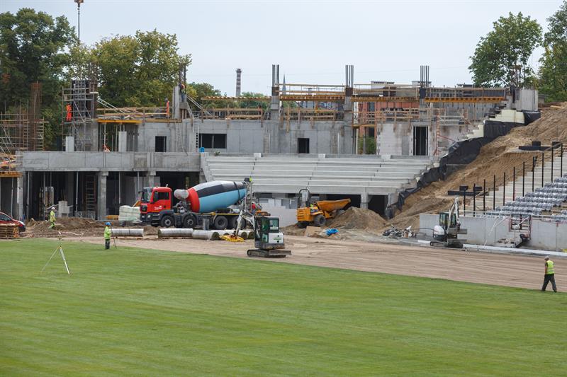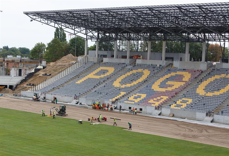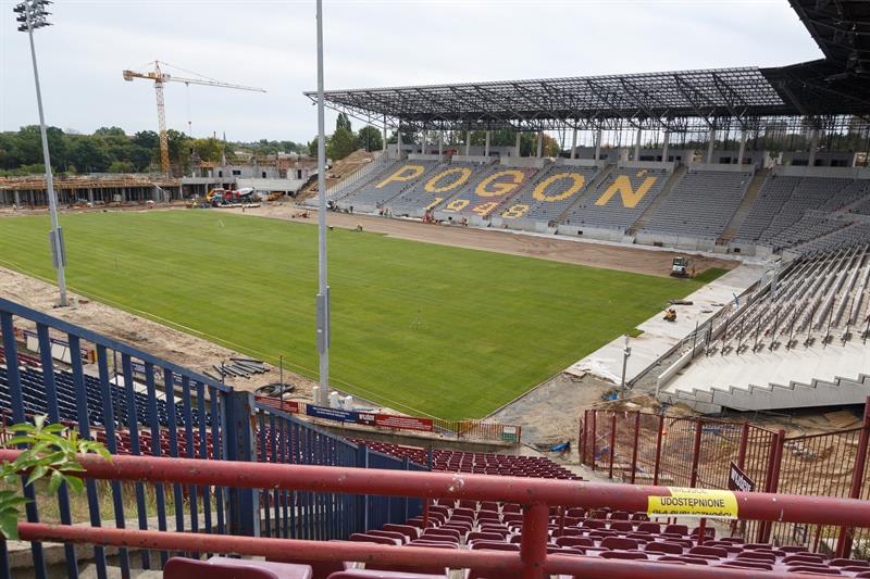 Na płycie głównej modernizowanego stadionu piłkarskiego w Szczecinie pojawiła się trawa. Oznacza to, że prace przesunięcia boiska w stronę trybun: południowej i zachodniej, oraz wymiana całego systemu grzewczego i nawadniającego dobiegają końca. Pogoń pierwszy mecz na nowej murawie ma rozegrać 13 września. Płyta boiska do tego czasu powinna być gotowa.