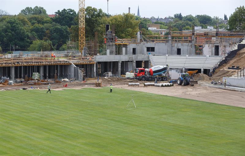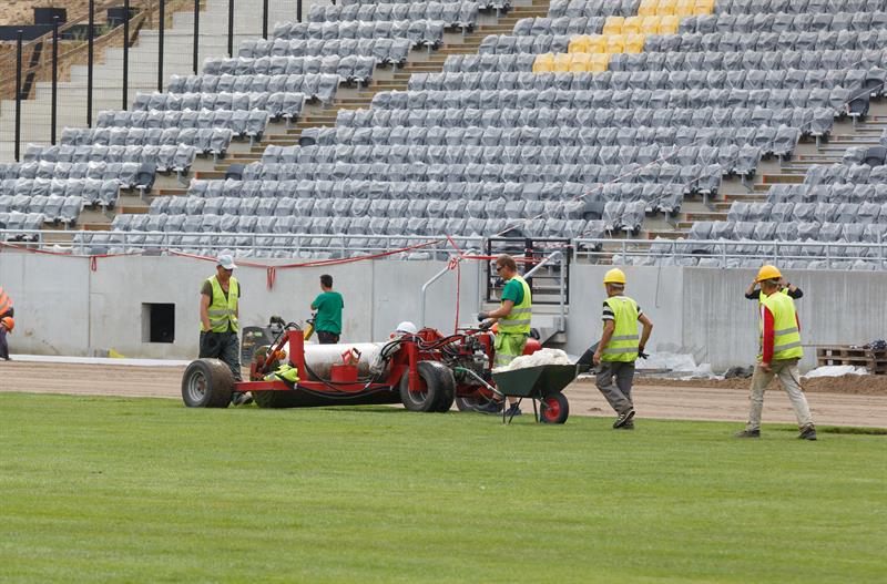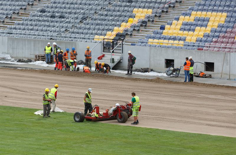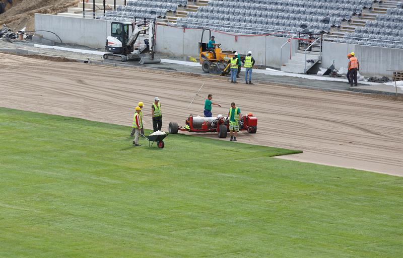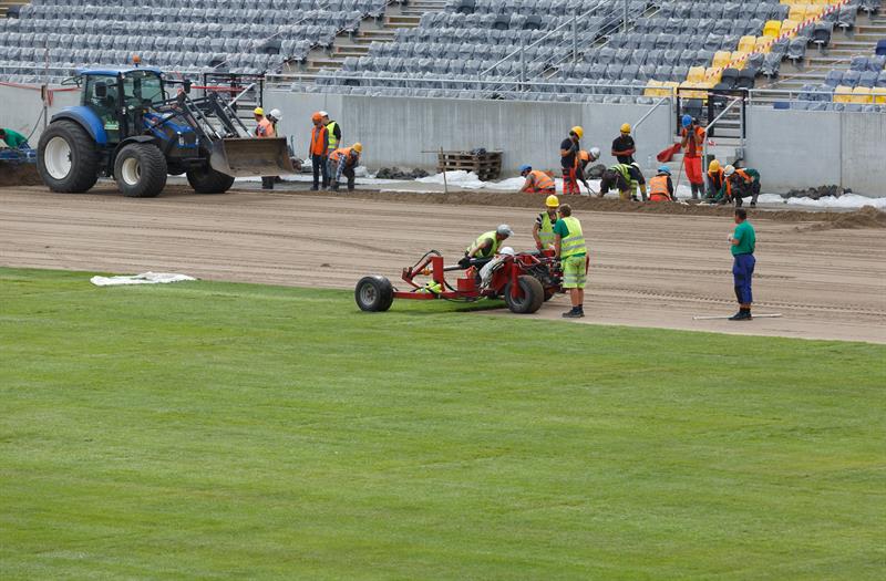 Pierwsze rolki trawy pojawiły się już w minioną środę, układanie kolejnych trwało kilka dni. Całe pole gry w pełnej krasie powinno być widoczne wkrótce. Trawa musi być obecnie poddana pielęgnacji, musi się odpowiednio zakorzenić. Nie powinno być z tym problemu, czasu jest wystarczająco, pora roku i odpowiednia pogoda sprzyjają pracom w tym zakresie.