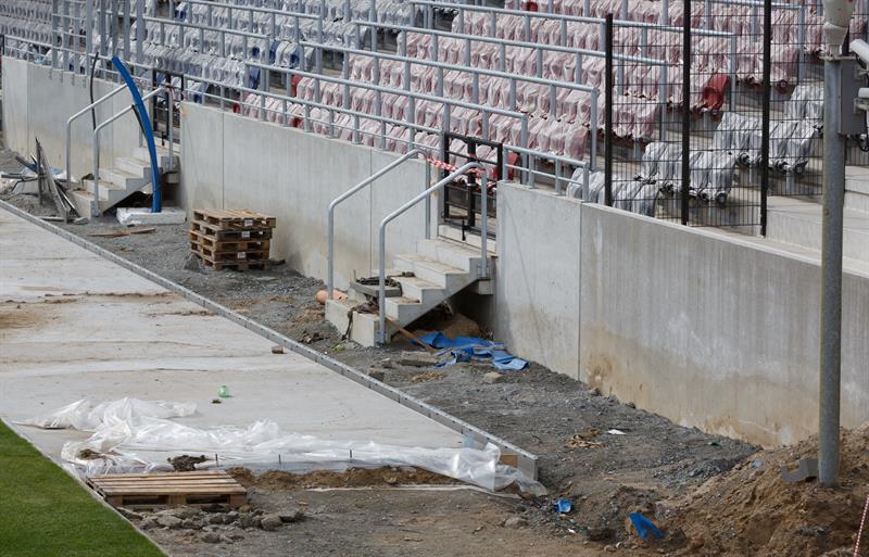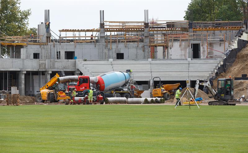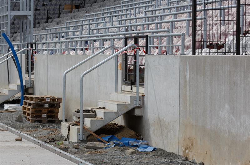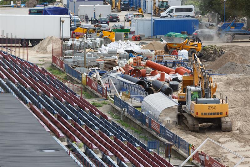 Jednocześnie trwają prace przy trybunie wschodniej i narożniku trybun wschodniej i południowej. W narożniku powstały już trzy kondygnacje, ułożono pierwsze stopnice trybun, natomiast na trybunie wschodniej wylewane są stropy, widok w tym miejscu nie przypomina użytkowanego obiektu piłkarskiego, ale jeden wielki plac budowy.