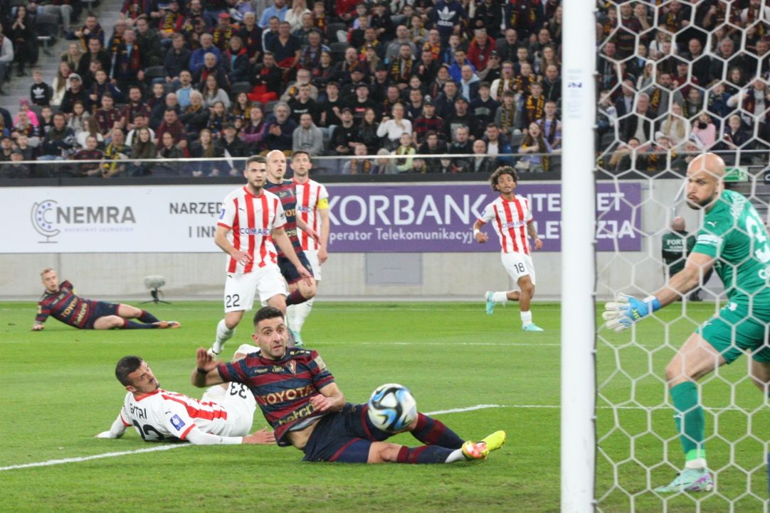 Pogoń nie zraziła się utratą bramki. Dominowała w każdym elemencie i tylko brakowało jej celnych strzałów. Portowców do ataków na bramkę krakowian podrywali aktywni Gorgon, Grosicki i włączający się w ofensywę Koútris. Na efekty nie trzeba było długo czekać, bo dogranie na pole karne Grosickiego, tak pechowo odbił Bitri, że piłka wpadła do bramki. Pogoń mimo kolejnych okazji przed przerwą nie potrafiła już zmienić wyniku.