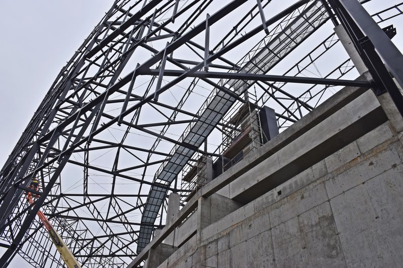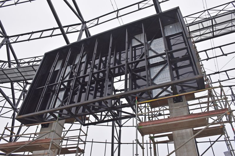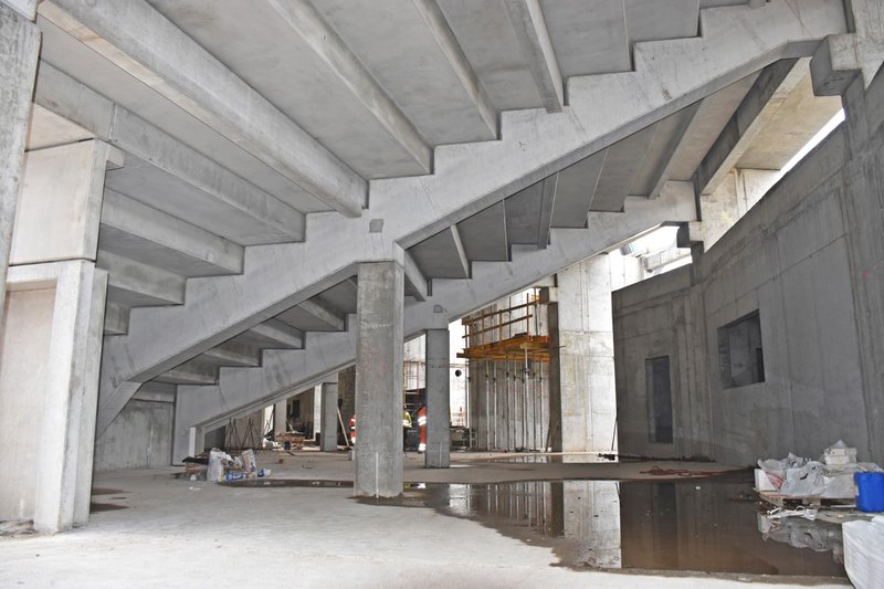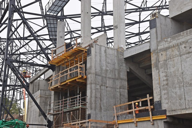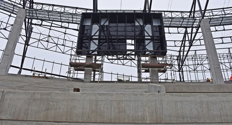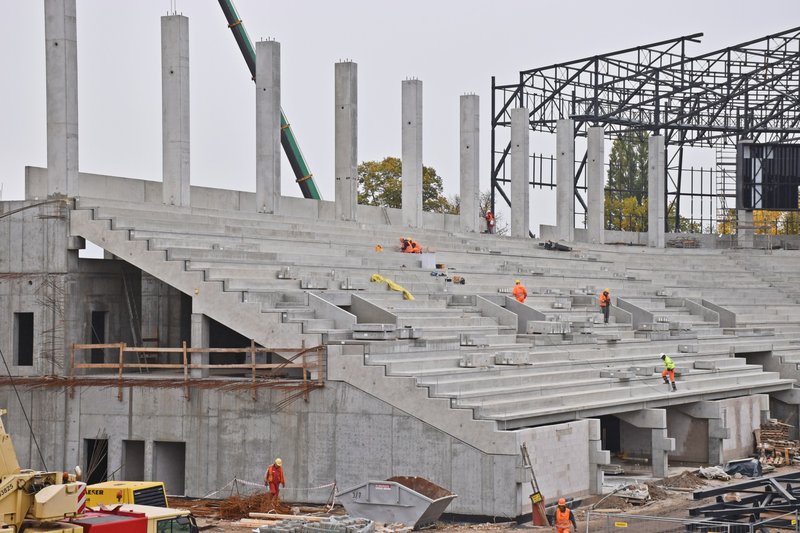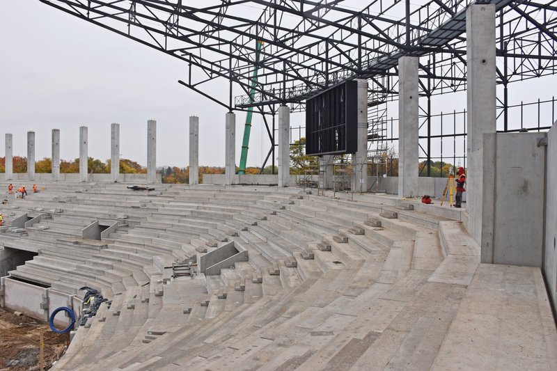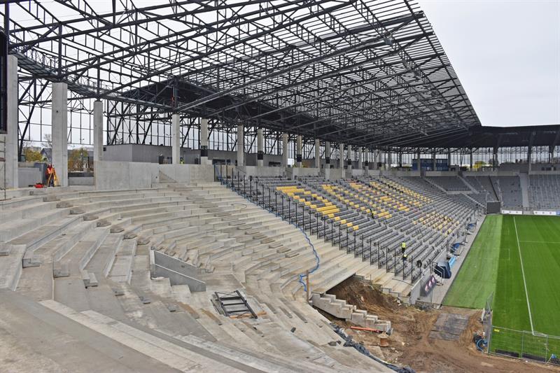 Na trybunie wschodniej wykonywane są kolejne fragmenty żelbetowej konstrukcji obiektu. Trwa montaż stalowych kratownic, będących elementami zadaszenia. Na dwóch filarach w narożniku trybuny wschodniej i południowej, zamontowano konstrukcję pod montaż telebimu. Na koronie obiektu prowadzone są prace wykończeniowe przy zagospodarowaniu terenu. Widoczne są już pierwsze nasadzenia zieleni, która znajdzie się na obiekcie.