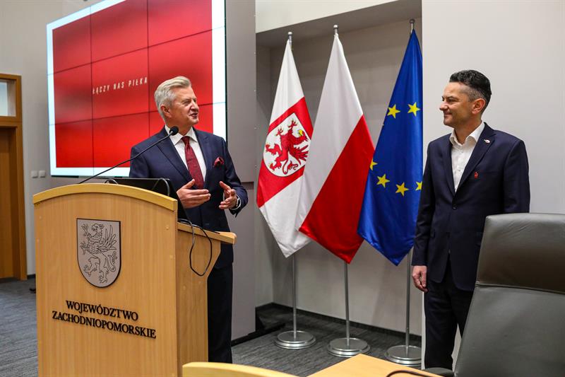 Stanisław Wziątek z zarządu województwa zachodniopomorskiego, i Maciej Mateńko, wiceprezes Polskiego Związku Piłki Nożnej ds. szkolenia, podpisali umowę o dofinansowanie programu "Pierwsza piłka" w naszym regionie. Kwota wsparcia to 50 tysięcy złotych.