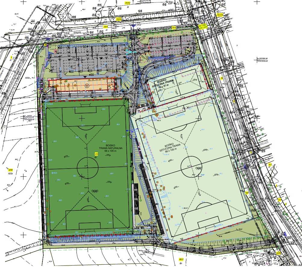 Inwestycja obejmuje budowę dwóch boisk (jednego ze sztuczną nawierzchnią, drugiego trawiastego) o wymiarach pola gry 105 m x 68 m; budowę boiska treningowego ze sztuczną nawierzchnią o wymiarach pola gry 18 m x 37 m; wykonanie budynku szatniowo-socjalnego wraz z wyposażeniem; zagospodarowanie terenu, wykonanie ogrodzenia, chodników i parkingu.