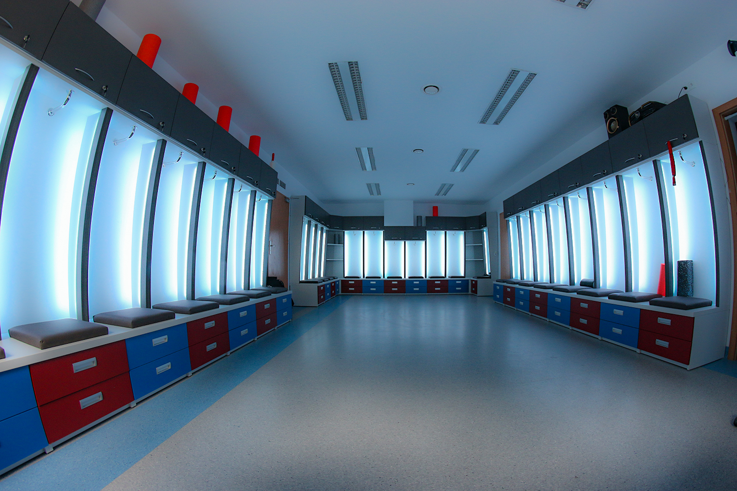 Przy każdym stanowisku zostało też zamontowane energooszczędne oświetlenie LED RGB, które zostało wykonane z zachowaniem wszystkich wymogów profesjonalnego działania. Wzięto pod uwagę wymiary szafek, możliwość ingerencji w mebel, a także styl aranżacji szatni. Różnokolorowe oświetlenie można kontrolować za pomocą pilota.