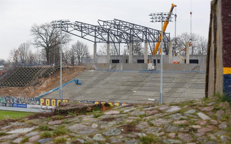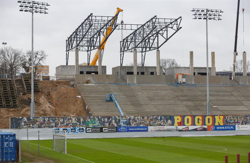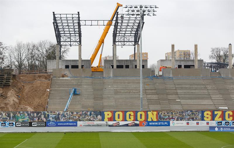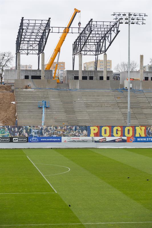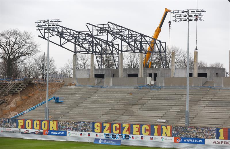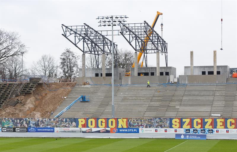 Na Stadionie Miejskim w Szczecinie nie ustają prace budowlane. Trwają nawet grubo po zmierzchu. Tak było też w ostatnią sobotę, kiedy pracownicy uwijali się w późnych godzinach wieczornych przy domykaniu trybuny łączącej część zachodnią z południową. Jest już gotowa. Obie trybuny jako całość prezentują się coraz bardziej efektownie.