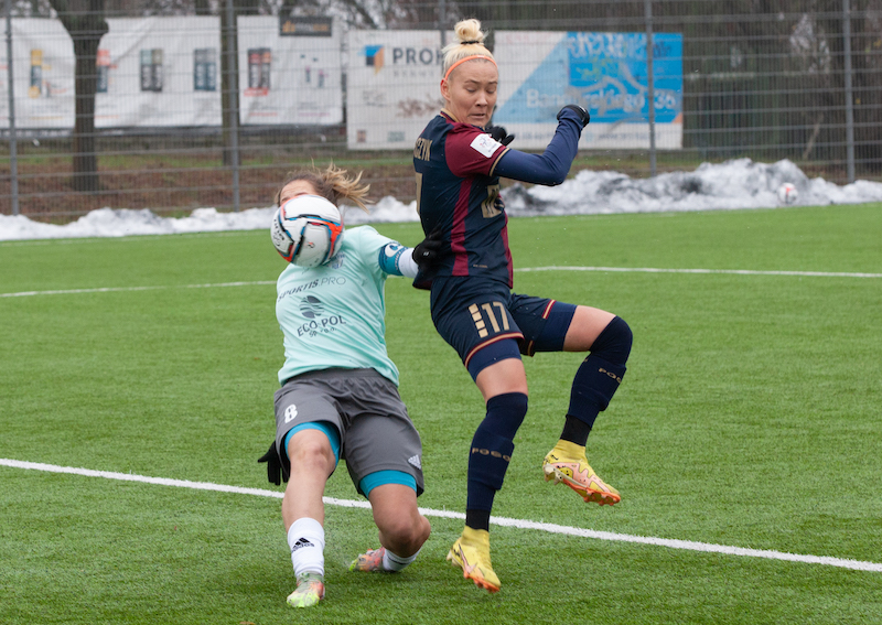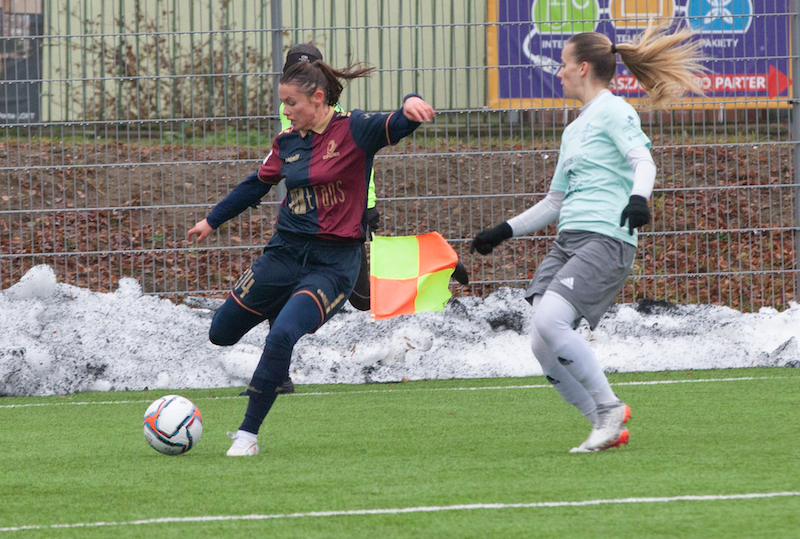 Spotkanie nie było porywającym widowiskiem. Mecz toczył się głównie w środkowej części boiska, w którym mieliśmy dużo walki i niedokładnych zagrań. W pierwszej połowie warto odnotować dwa strzały szczecinianek. Raz w polu karnym uderzała Roksana Ratajczyk, ale dobrze broniła Natalia Piątek. Za drugim razem z piłką w polu karnym odnalazła się Weronika Szymaszek, ale mając dużo miejsca i czasu...nie trafiła w bramkę.