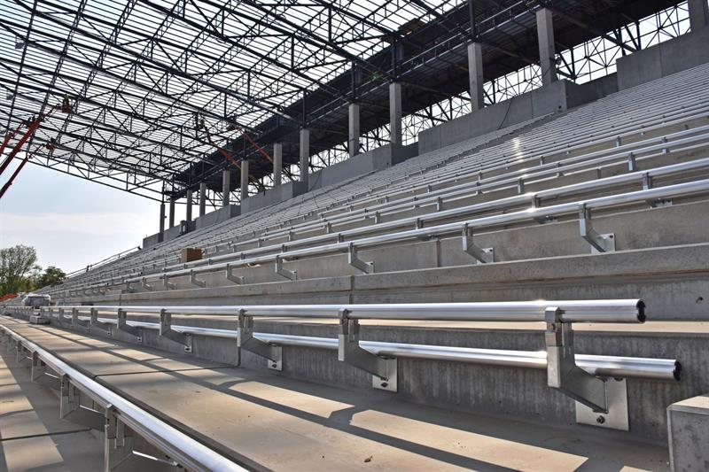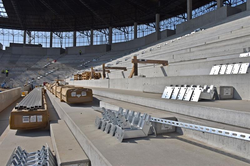 Trwa montaż uchwytów pod krzesełka na nowych trybunach. W zależności od postępu prac krzesełka powinny być montowane w połowie maja. W ostatnim czasie wykonywana była również podkonstrukcja pod przezroczyste poliwęglanowe pokrycie dachu nad trybuną południową.