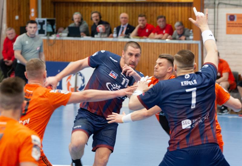 Pierwsza połowa przebiegała pod dyktando gospodarzy i dopiero tuż przed przerwą strat do jednej bramki zniwelowali Zaremba i Kapela. Druga część spotkania rozpoczęła się od trzech bramek dla Sandra SPA Pogoni, na które szybko odpowiedzieli czterema bramkami gospodarze. W 40 minucie po bramce ze skrzydła Dawida Krysiaka ponownie był remis. Potem prowadzenie zmieniało się jak w kalejdoskopie, a minutę przed końcem było 30:30. Pogoń mimo, że grała końcówkę w osłabieniu rozstrzygnęła ją na swoją korzyść. Najpierw udaną interwencją popisał się Viunyk, a potem Starcevic asystował przy bramce Bosego, a chwilę później sam ustalił wynik meczu.