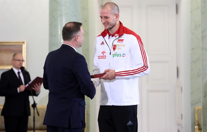 Andrzej Duda uhonorował także całą drużynę reprezentacyjną wręczając jej kapitanowi Michałowi Kubiakowi flagę narodową. Siatkarze zrewanżowali się przekazując prezydentowi koszulkę reprezentacji Polski z numerem 6. (pap)