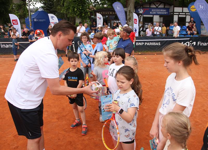 W samo południe rozpoczęło się spotkanie dzieci z Marcinem Matkowskim. Najbardziej utytułowanych wychowanek SKT, finalista turniejów wielkoszlemowych, triumfator Pekao Open opowiadał o swojej karierze i przeprowadził zajęcia z dziećmi.