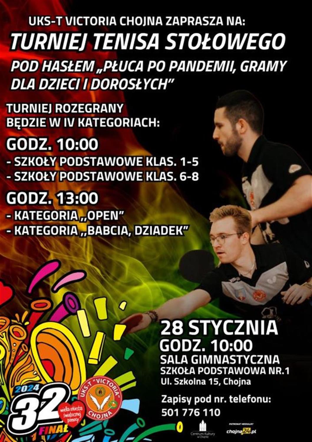 28 stycznia klub UKS-T Victoria Chojna organizuje Turniej Tenisa Stołowego pod hasłem ,,Płuca po pandemii, gramy dla dzieci i dorosłych".