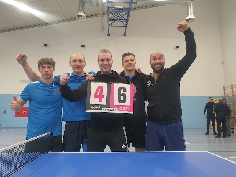 Początek meczu należał do gospodarzy, którzy wygrali oba pojedynki, lecz w dwóch kolejnych zwyciężyli już szczecinianie. Dla Griffin's-Spin punktowali: Niemiec Dauud Cheaib, który na pierwszym stole pokonał Łukasza Jarockiego i Grzegorza Janczewskiego (oba 3:1) oraz Arkadiusz Żuk, który na drugim stole wygrał z Jackiem Mitasem (3:1) i Mateuszem Ufnalem (3:0). Kluczowe okazały się spotkania deblowe, w których lepsi okazali się goście. Komplet punktów dla przyjezdnych zdobyli: Cheaib i Żuk (po 2.5), a punkt w parze deblowej wywalczył duet: Kamil Nalepa (0.5) i Kamil Kiljanek (0.5). Na poziomie I ligi to pierwsza, historyczna wygrana drużyny Griffin's-Spin. W poprzednim sezonie udało się szczecinianom dwa razy zremisować.