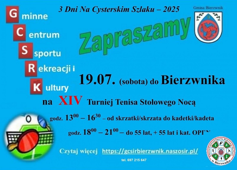 W sobotę 19 lipca rozegrany zostanie w Bierzwniku - XIV Turniej Tenisa Stołowego Nocą o Puchar Wójta Gminy Bierzwnik. Turniej odbędzie się w ramach wydarzenia "3 Dni na Cysterskim Szlaku". Rozgrywki dla dzieci i młodzieży (skrzaty/skrzatki oraz kadeci/kadetki) rozpoczną się od godz. 13, zaś dla dorosłych (kategorie do 55 lat, powyżej 55 lat, OPEN) od godz. 18. Na zawodników czekają nagrody, poczęstunek, sportowe emocje i niepowtarzalna nocna atmosfera.