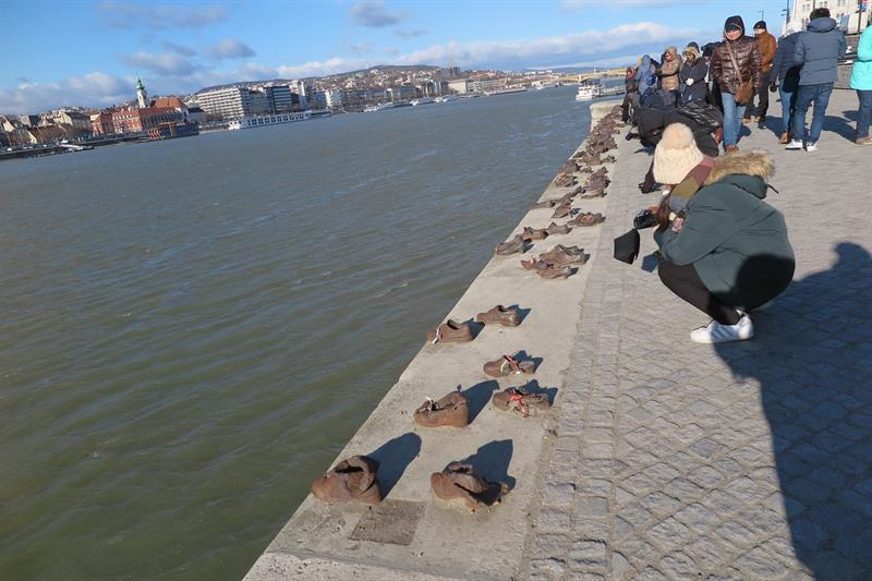 Na nabrzeżu, niedaleko Parlamentu, między placami Roosevelta i Kossutha, stoją buty, 60 par butów, dużych i małych, odlanych z żeliwa. W czasie Zagłady ludzie, dorośli i dzieci, ściągali tutaj obuwie przed rozstrzelaniem przez strzałokrzyżowców, a modry Dunaj stawał się czerwony od krwi.