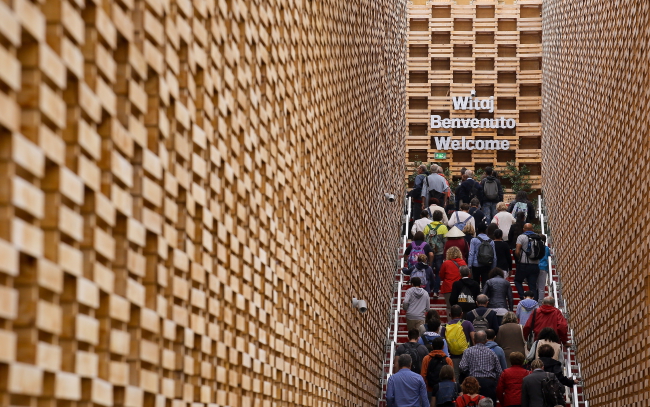 Na zdjęciu: Polski pawilon, podczas inauguracji obchodów Dnia Polskiego w ramach Wystawy Światowej EXPO 2015 w Mediolanie. Jego elewacja nawiązuje do skrzynek na jabłka, których Polska jest największym eksporterem w świecie. Gościom rozdano już kilka ton jabłek.