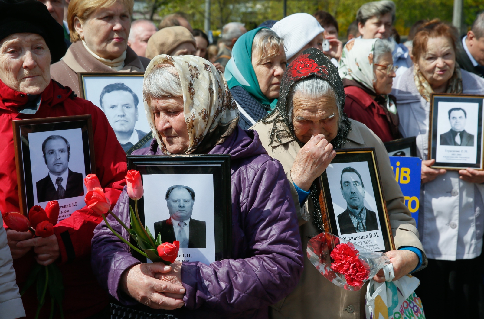 Na zdjęciu: Kobiety trzymają portrety swoich mężów zmarłych podczas usuwania skutków katastrofy.