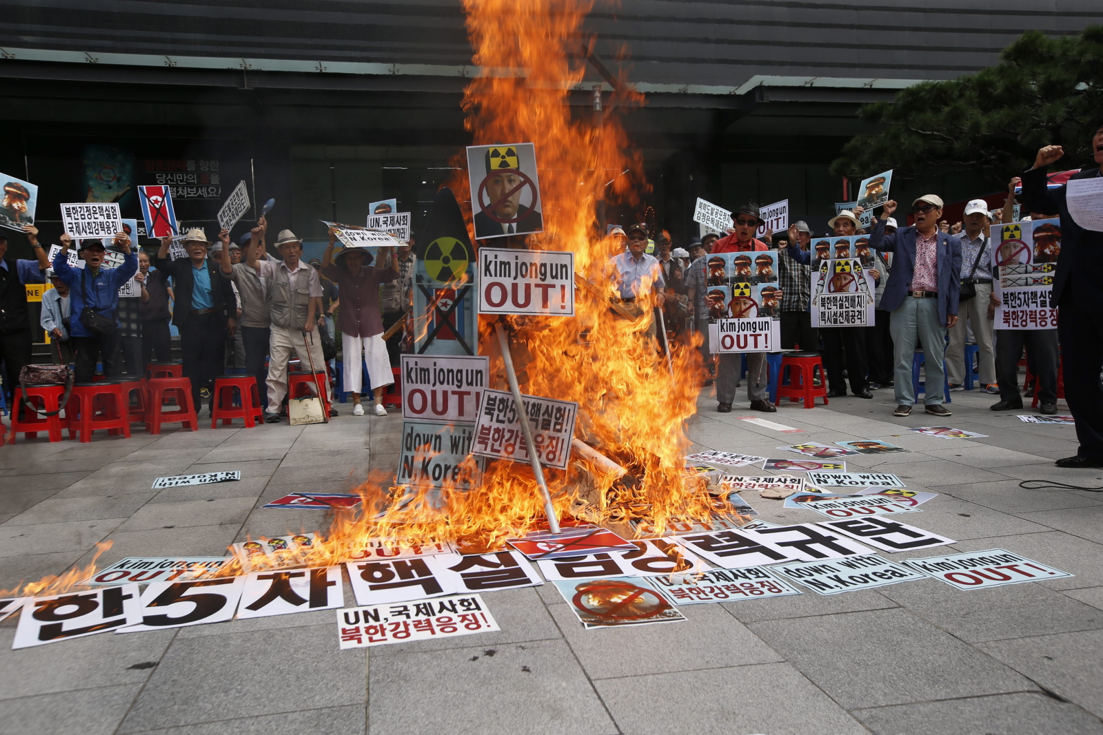 Na zdjęciu: Południowokoreańscy aktywiści w Seulu palą wizerunki północnokoreańskiego przywódcy Kim Dzong Una w proteście przeciwko kolejnym północnokoreańskim próbom nuklearnym.