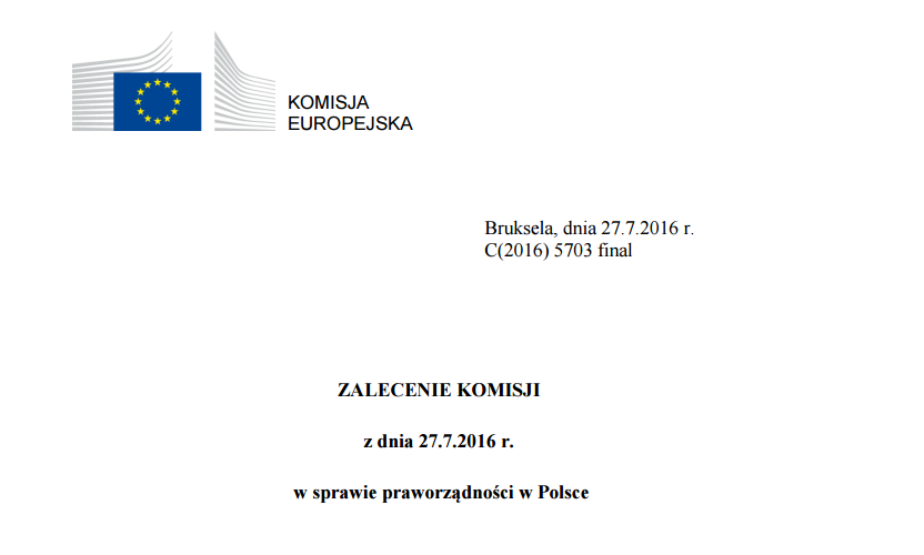 Innym zaleceniem wydanym pod koniec lipca było przestrzeganie wyroków z 3 i 9 grudnia 2015 r. oraz ich pełne wykonanie. Zgodnie z tymi wyrokami stanowiska sędziów Trybunału Konstytucyjnego ma objąć "trzech sędziów wybranych zgodnie z prawem przez poprzedniego ustawodawcę w październiku 2015 r., a nie trzech sędziów wybranych przez nowego ustawodawcę bez ważnej podstawy prawnej". Lipcowe zalecenia były przejściem do drugiego etapu procedury ochrony praworządności, wszczętej wobec Polski w styczniu. Zdaniem KE w Polsce istnieje "systemowe zagrożenie dla państwa prawa".