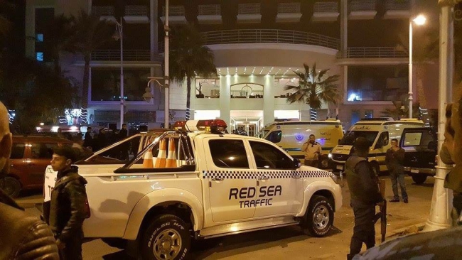 Według resortu egipskie służby bezpieczeństwa otworzyły ogień do dwóch napastników. Jeden z nich został zabity, a drugi ranny. Poinformowano, że mężczyźni uzbrojeni w noże, a także - według różnych źródeł - w broń palną i pasy z materiałami wybuchowymi weszli do restauracji hotelu "Bella Vista", znajdującej się na zewnątrz budynku, i zaatakowali turystów. Napastnicy mieli krzyczeć "Allah akbar".