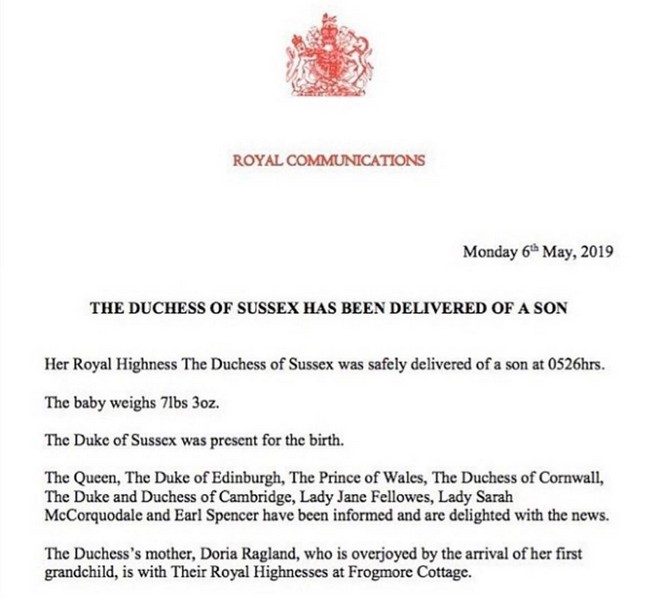 Pierwszy syn pary urodził się o 5.26 rano (6.26 w Polsce). Zgodnie z tradycją jako pierwsi o jego narodzinach dowiedzieli się królowa Elżbieta II oraz jej mąż książę Filip, ojciec Harry'ego i następca tronu książę Karol oraz jego brat, książę William z księżną Kate.
