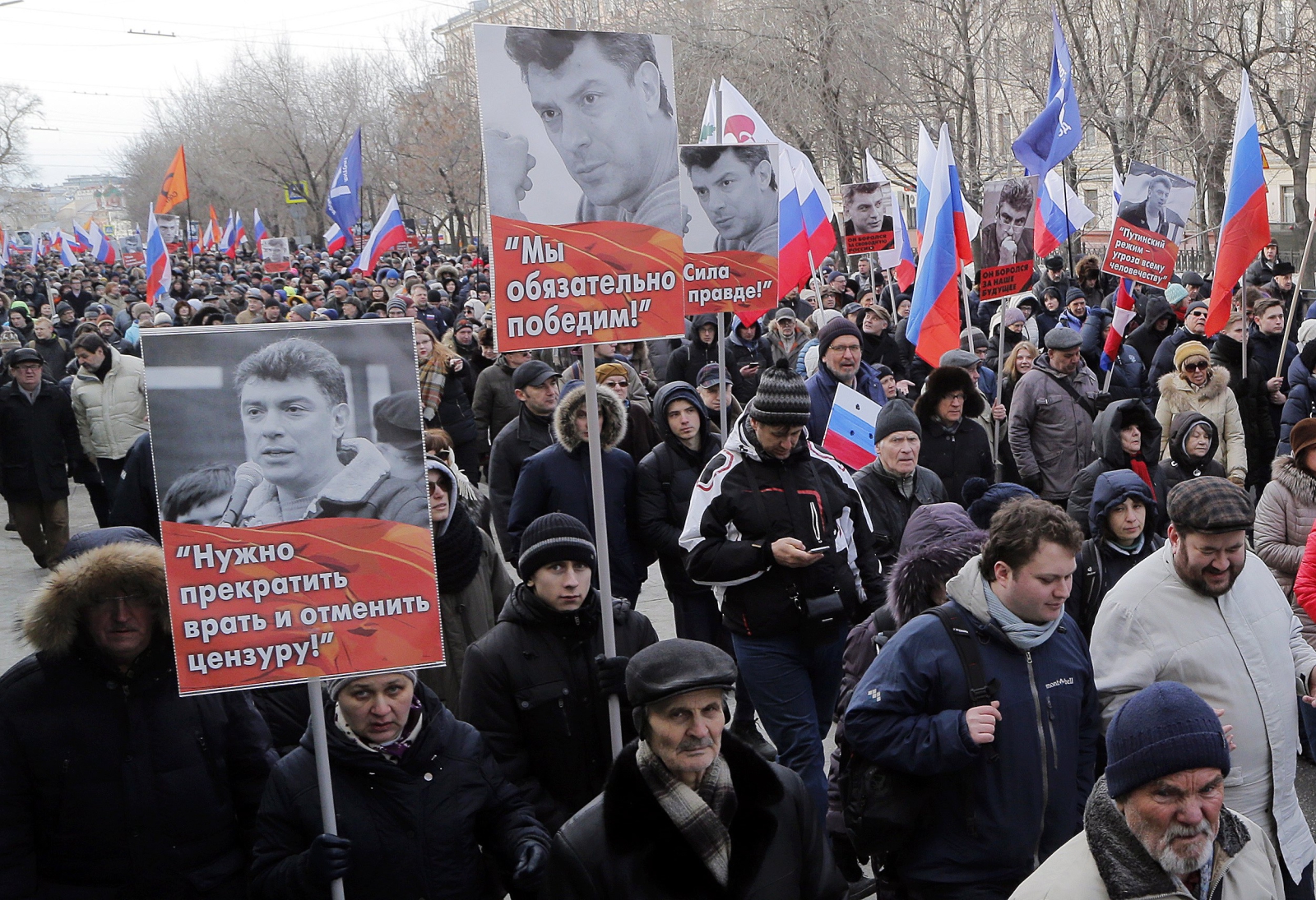 Uczestnicy nieśli portrety Niemcowa i hasła z cytatami z jego wystąpień. Na czele pochodu szli działacze partii opozycyjnych, w tym partii Parnas, której Niemcow współprzewodniczył. Nad głowami tłumu powiewały sztandary partyjne, a także flagi Rosji. Politycy na czele kolumny rozwinęli transparent z napisem „Bohaterowie nie umierają! Rosja będzie wolna!”.