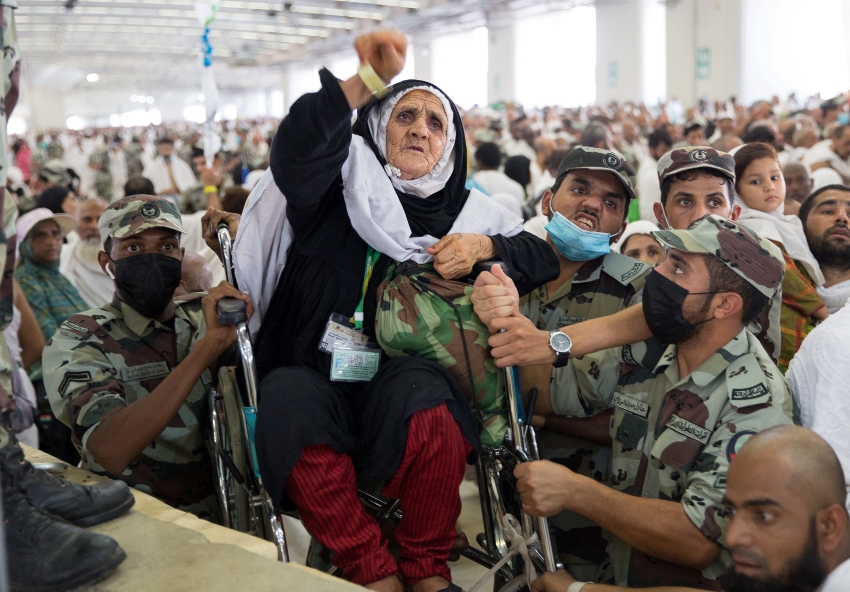 Na zdjęciu: Żołnierze podnoszą kobietę na wózku, by mogła wziąć udział w rytuale kamienowania szatana. Fot. EPA/STR