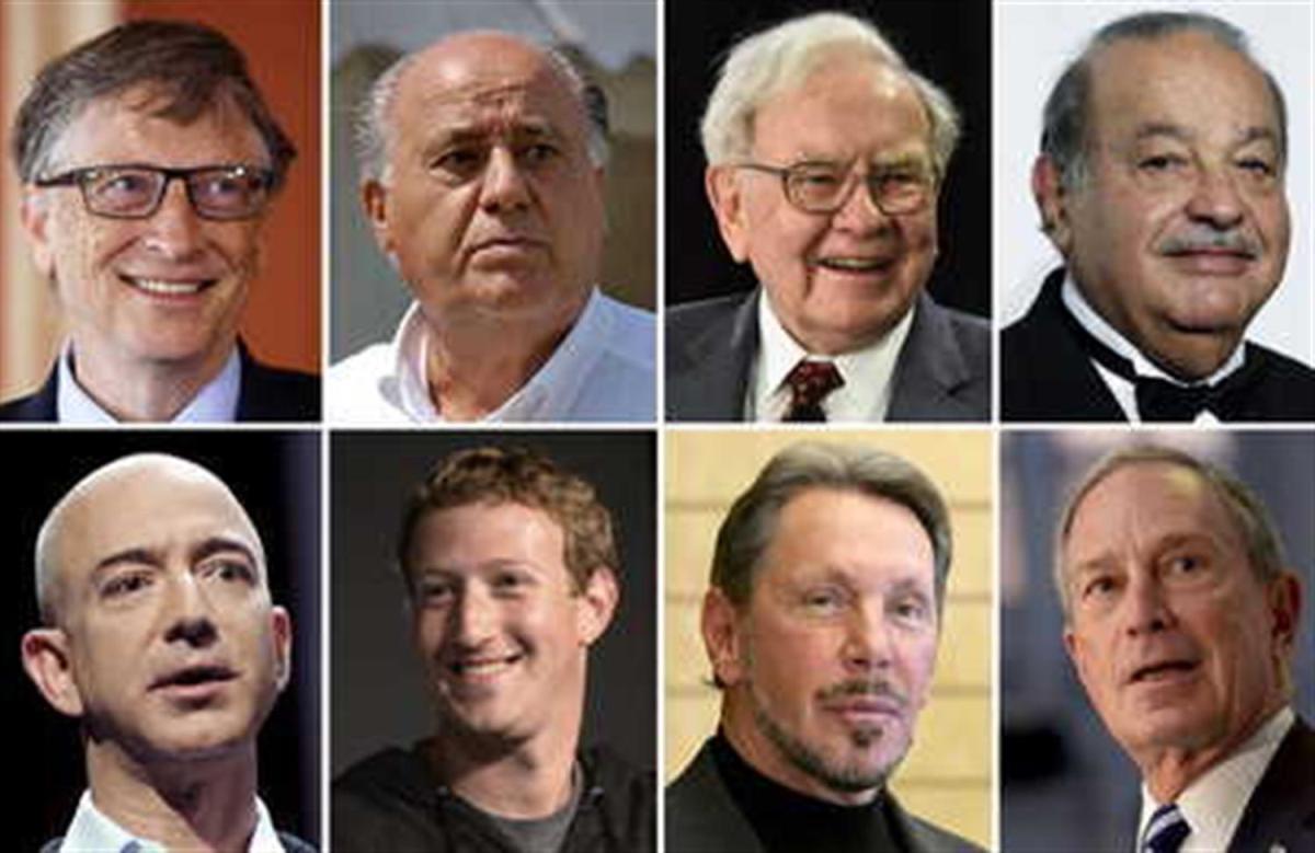 Osiem najzamożniejszych osób na świecie to (na zdj. górny rząd od lewej): współzałożyciel Microsoftu Bill Gates (majątek szacowany na 75 mld dol.), założyciel grupy odzieżowej Inditex Amancio Ortega (67 mld dol.), inwestor Warren Buffett (60,8 mld dol.), potentat handlowy i przemysłowy z Meksyku Carlos Slim Helu (50 mld dol.), (na zdj. dolny rząd od lewej) założyciel internetowego sklepu wysyłkowego Amazon Jeff Bezos (45,2 mld dol.), współzałożyciel i szef Facebooka Mark Zuckerberg (44,6 mld dol.), współzałożyciel i szef koncernu informatycznego Oracle Larry Ellison (43,6 mld dol.) oraz właściciel koncernu Bloomberg, Michael Bloomberg (40 mld dol.).