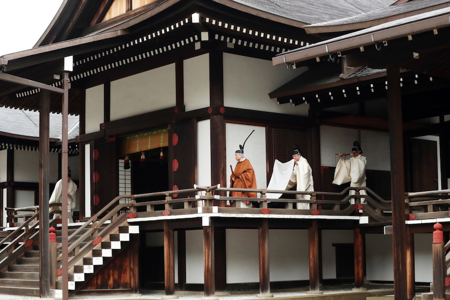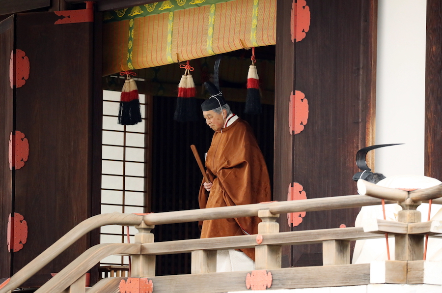 We wtorek rano cesarz rozpoczął uroczystości abdykacyjne od modlitwy w świątyni Kashikodokoro, poświęconej bogini słońca Amaterasu, od której według tradycyjnych wierzeń pochodzą japońscy cesarze. Odczytał oświadczenie informujące przodków o uroczystości abdykacyjnej.