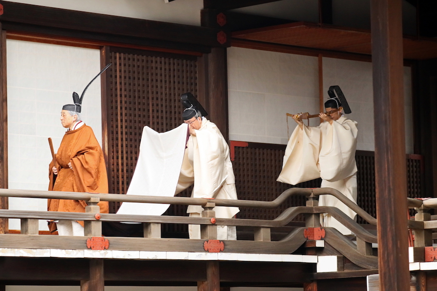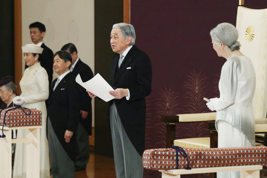 W ceremonii, transmitowanej na żywo w telewizji, wzięło udział ok. 300 osób, w tym premier Japonii Shinzo Abe, książę Naruhito, jego żona, księżniczka Masako, oraz przewodniczący obu izb parlamentu i sędziowie sądu najwyższego. Premier Abe wyraził wdzięczność wobec ustępującego cesarza za to, że „zawsze dzielił z narodem radość i smutek”.